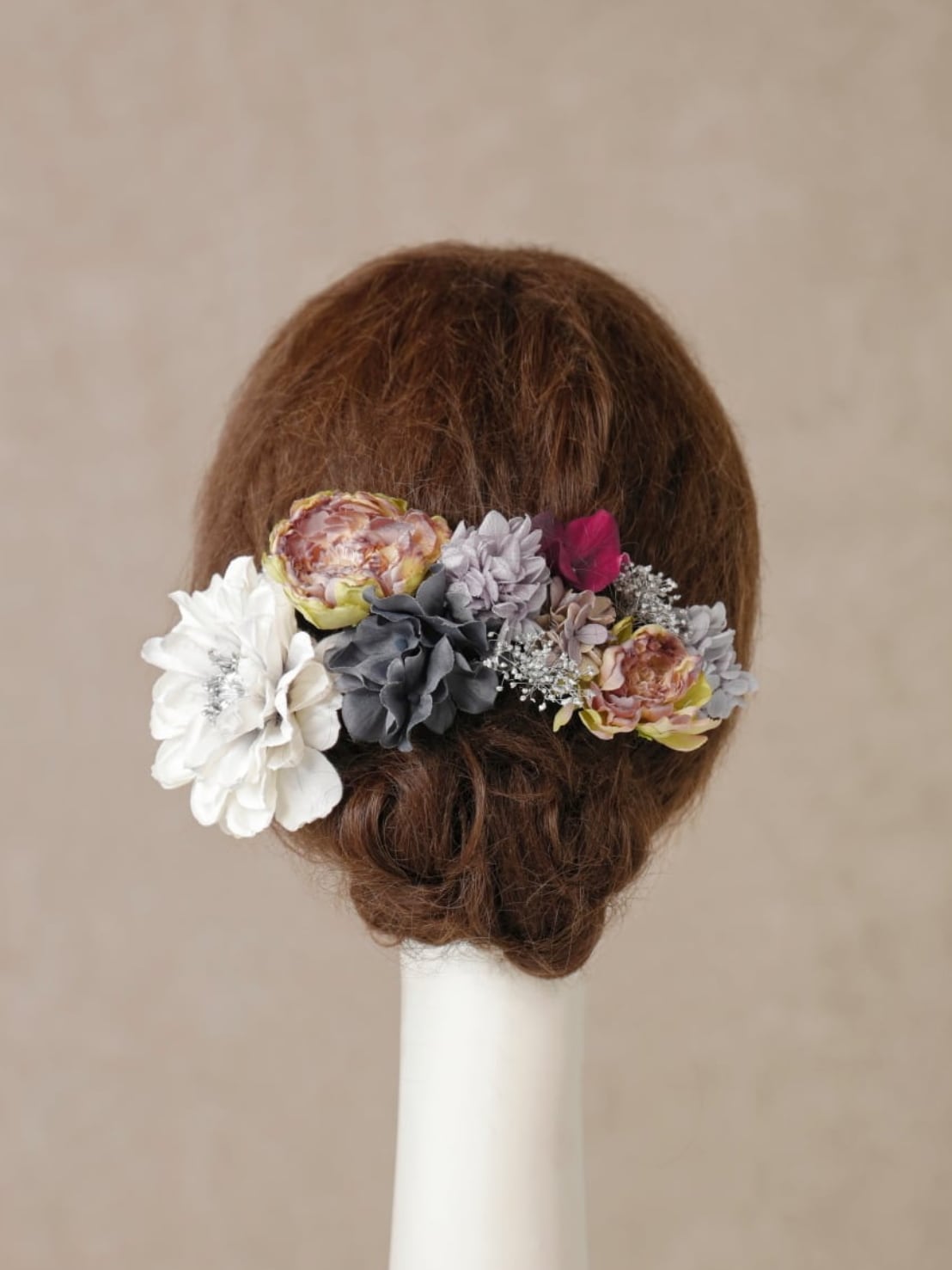 当店の髪飾りは、全体の雰囲気やバランスを大切にし、既製の小枝ビジューを使用しております。