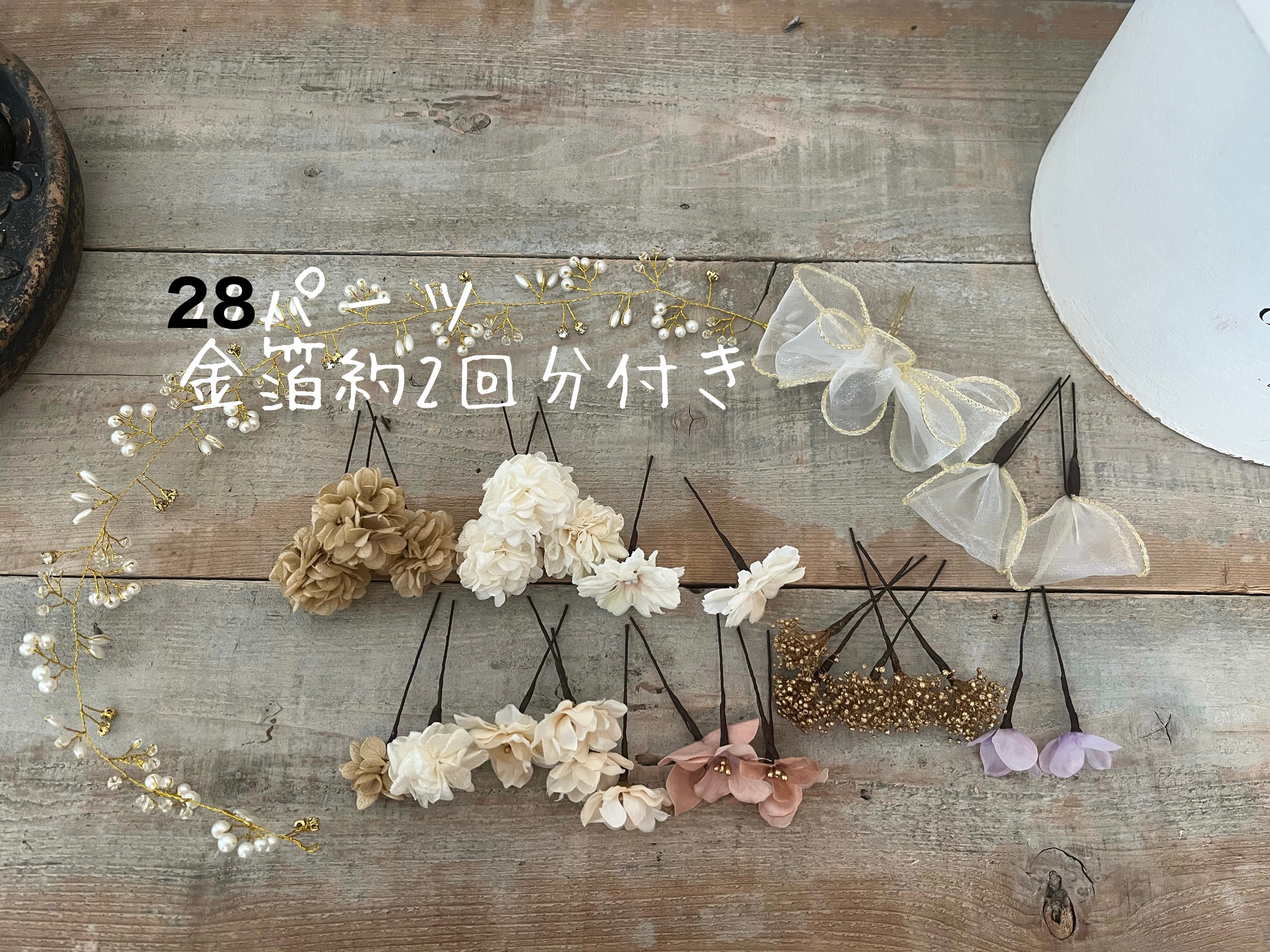 こちらの価格には、1パーツ450円〜飾りにより変わります。こちらの髪飾りはパーツ量が多い為小枝ビジューを安価な品でお値段をおさえております。