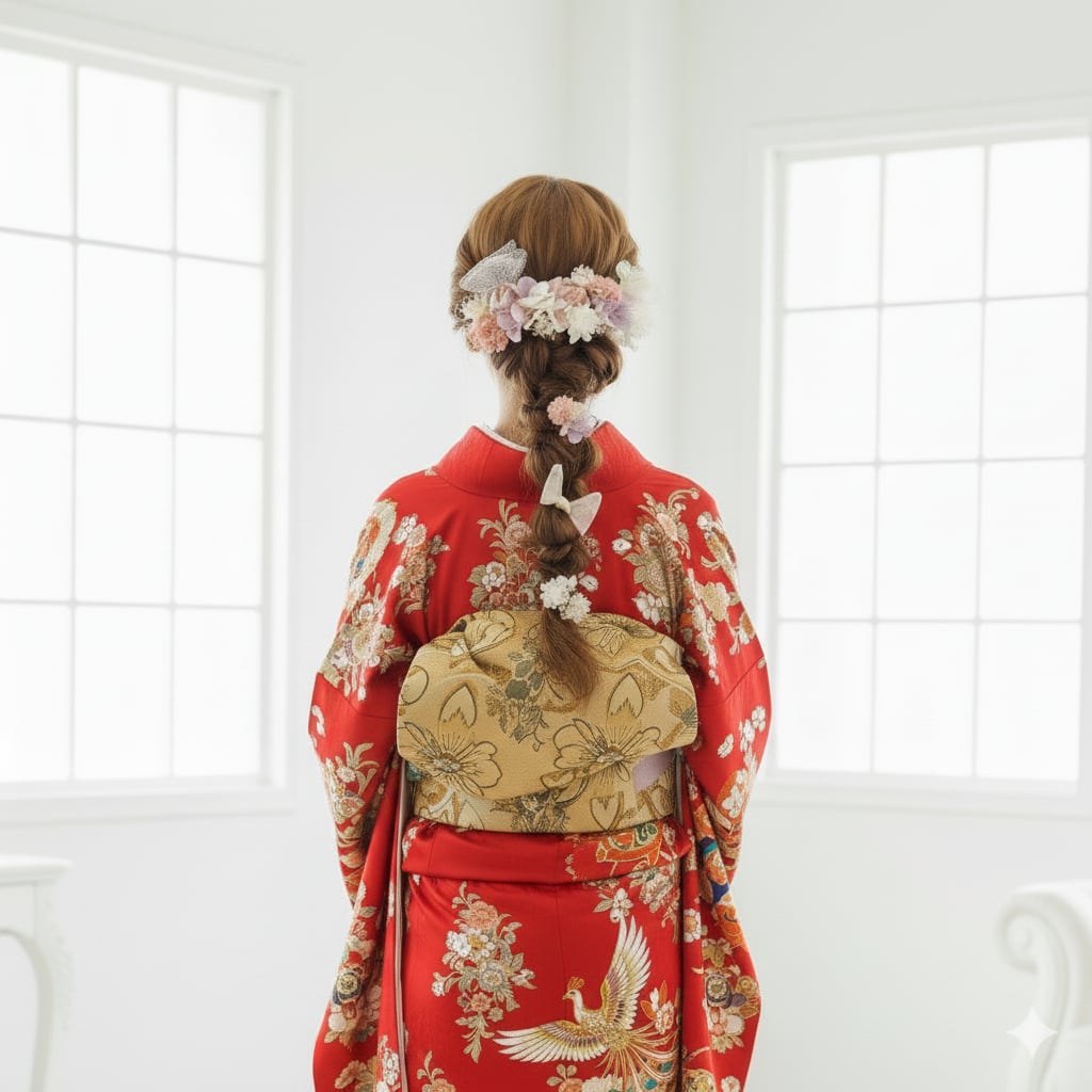 リボンやチュールで可愛らしくデザインした髪飾りはイエベスプリング、淡いお着物に似合います