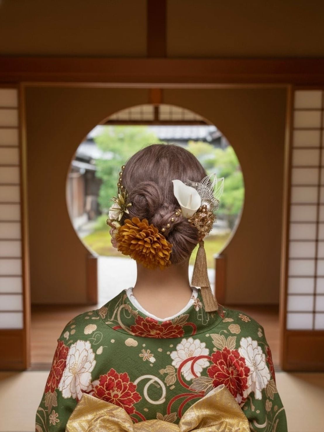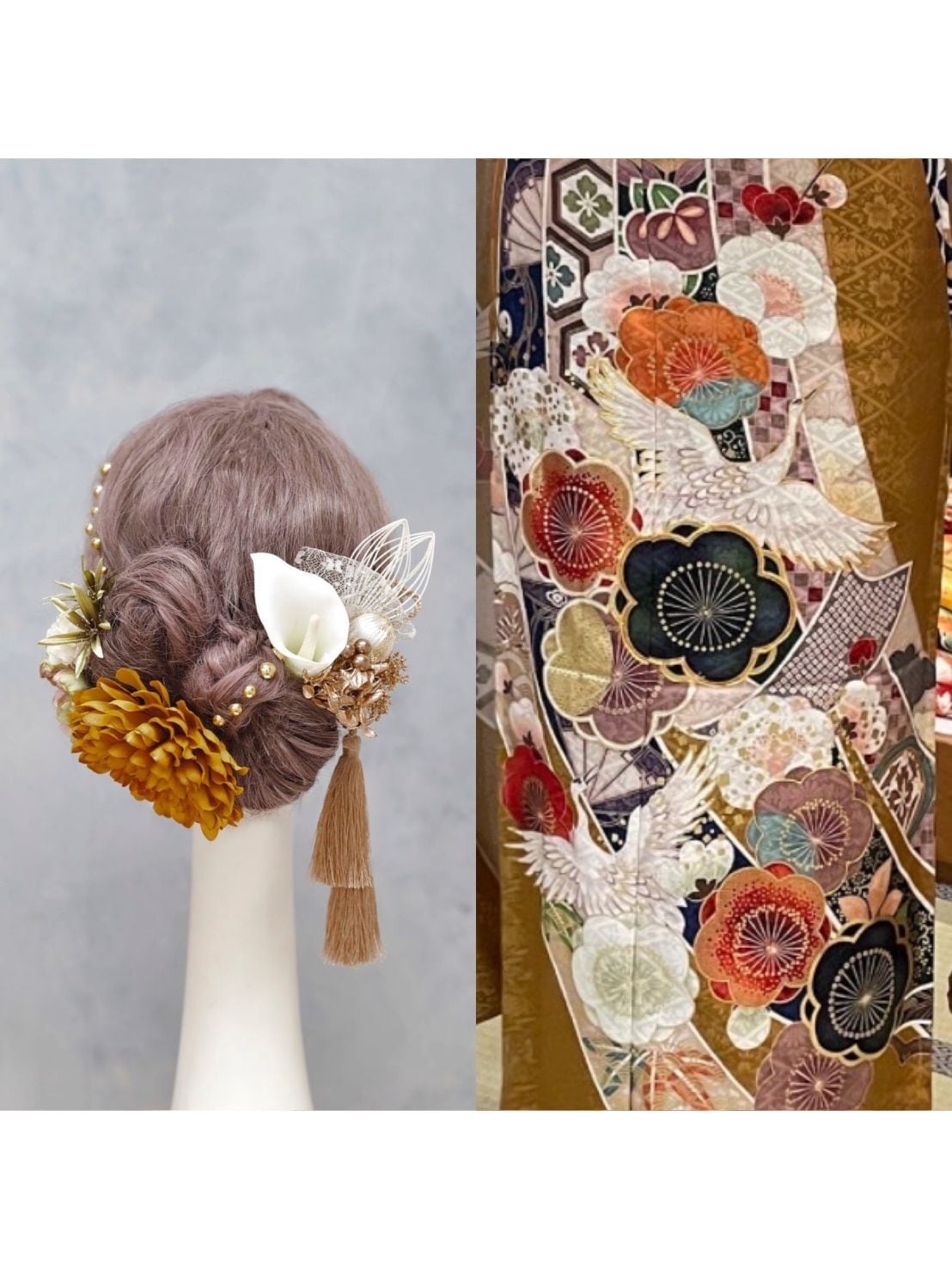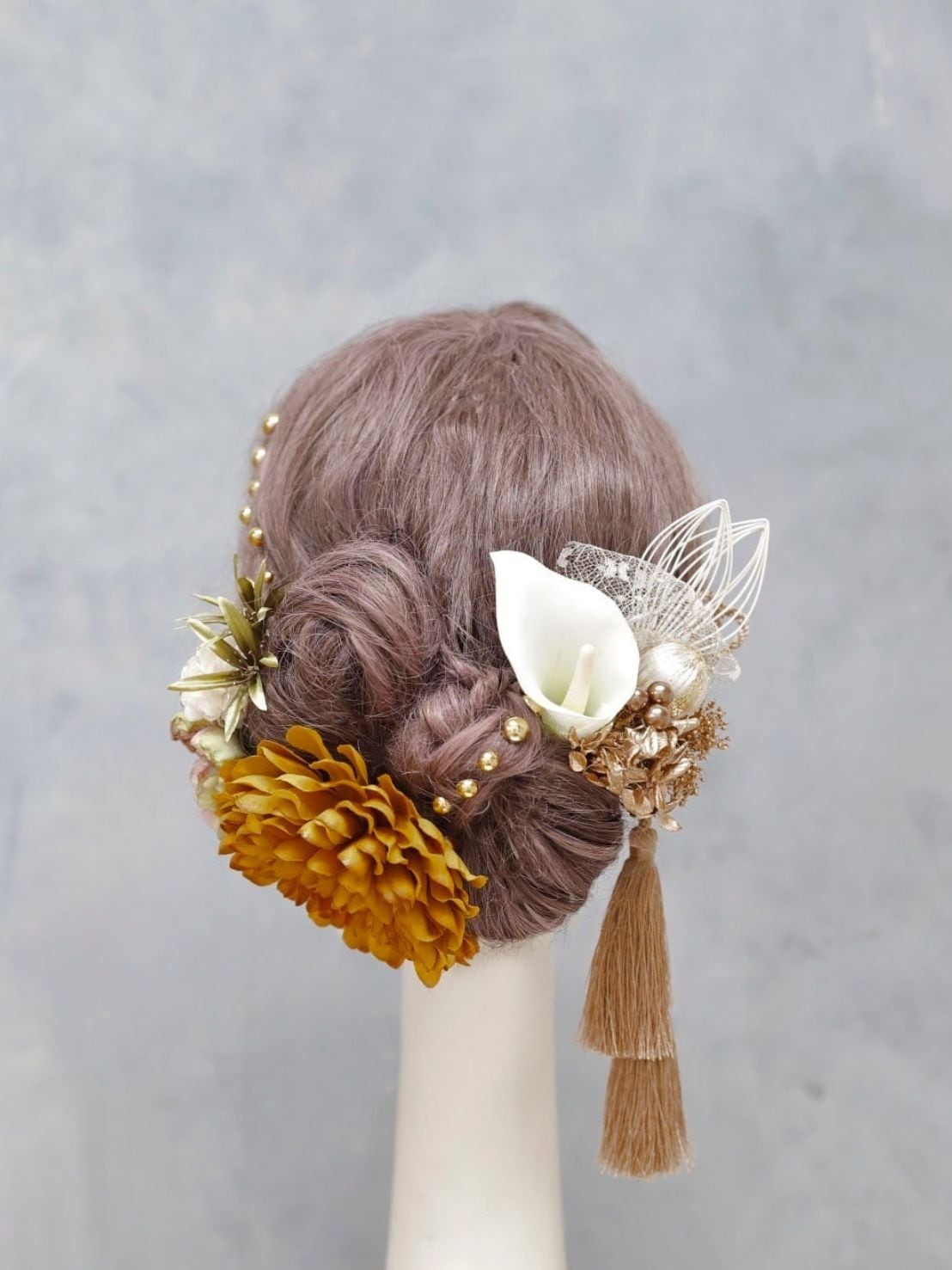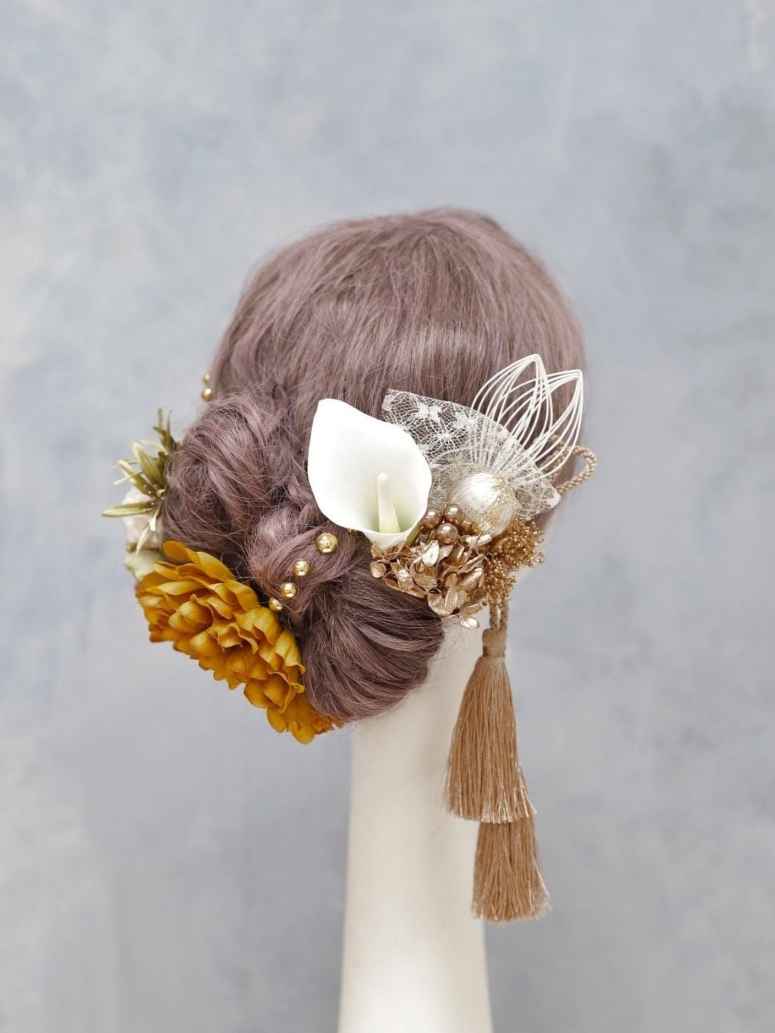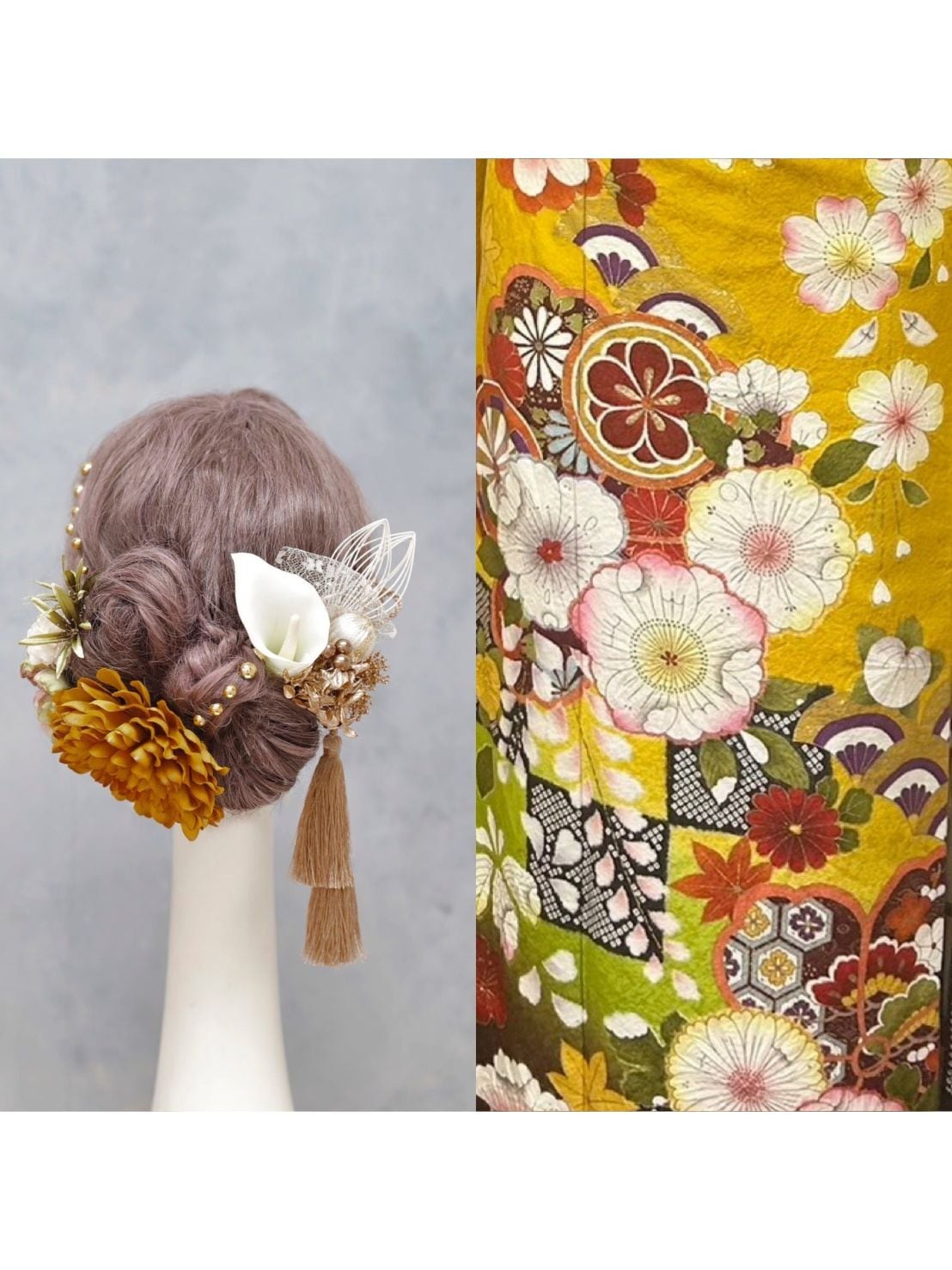 マスタードイエローダリア髪飾り|成人式 卒業式に映えるリボンヘア カチモリヘア タイトシニヨン