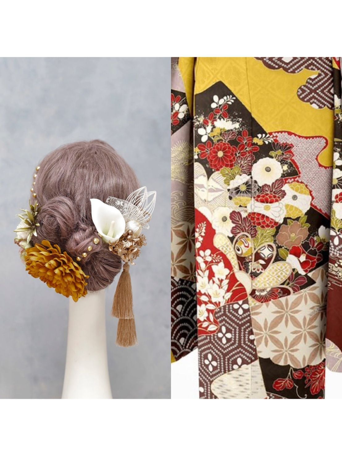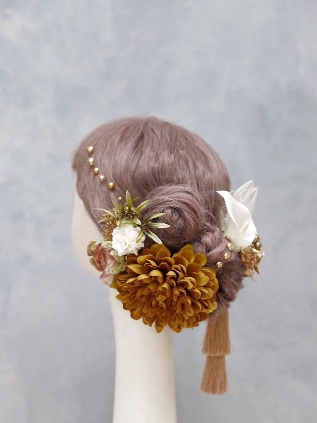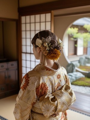 成人式や卒業式などの大切な日の装いにぴったりの髪飾りをご用意しました。マスタードイエローのダリアが、リボンヘアやカチモリ、タイトシニヨンに上品に映え、大人っぽい印象を与えます。華やかさと洗練された佇まいが、あなたの魅力を引き立てます。