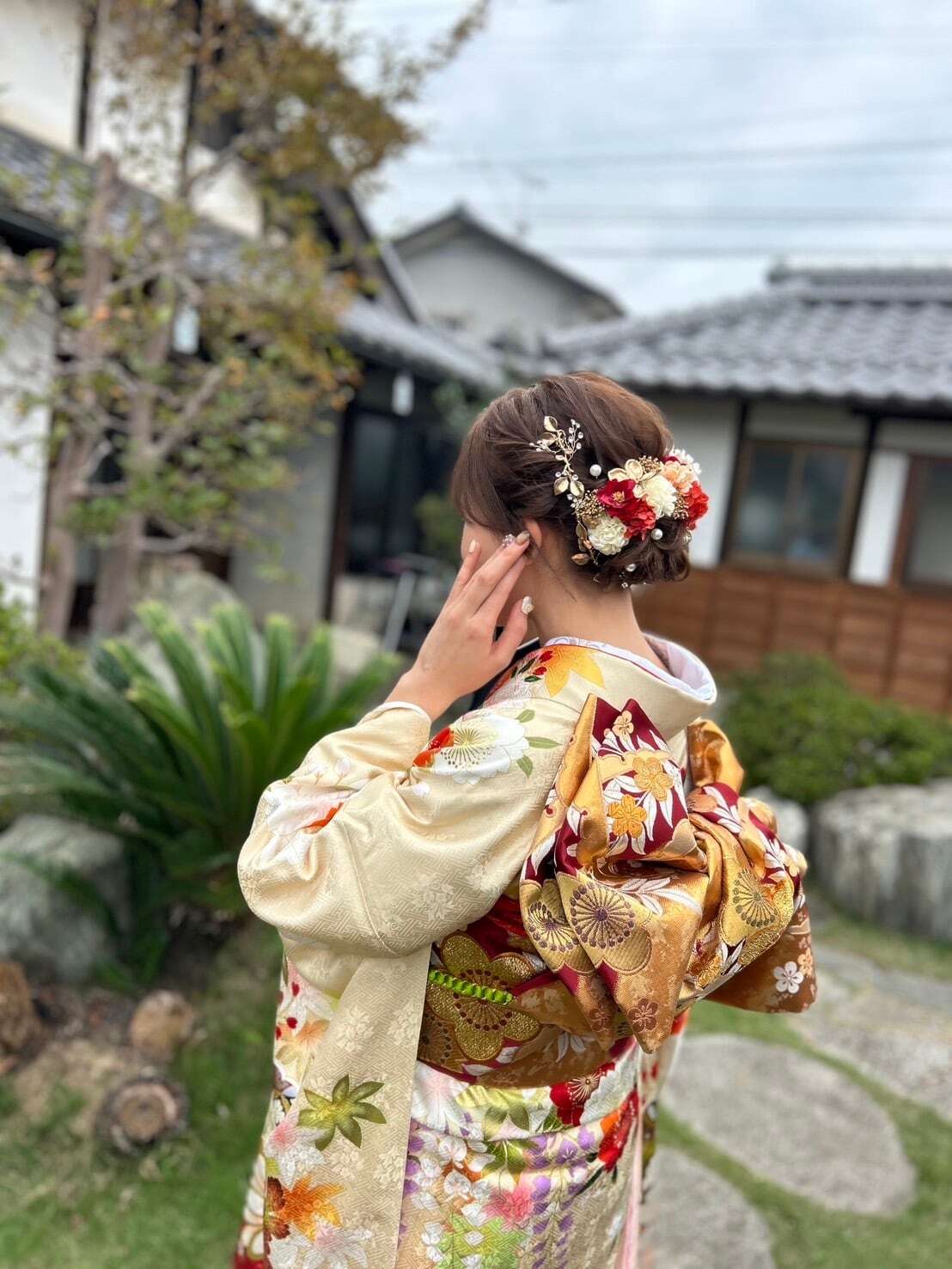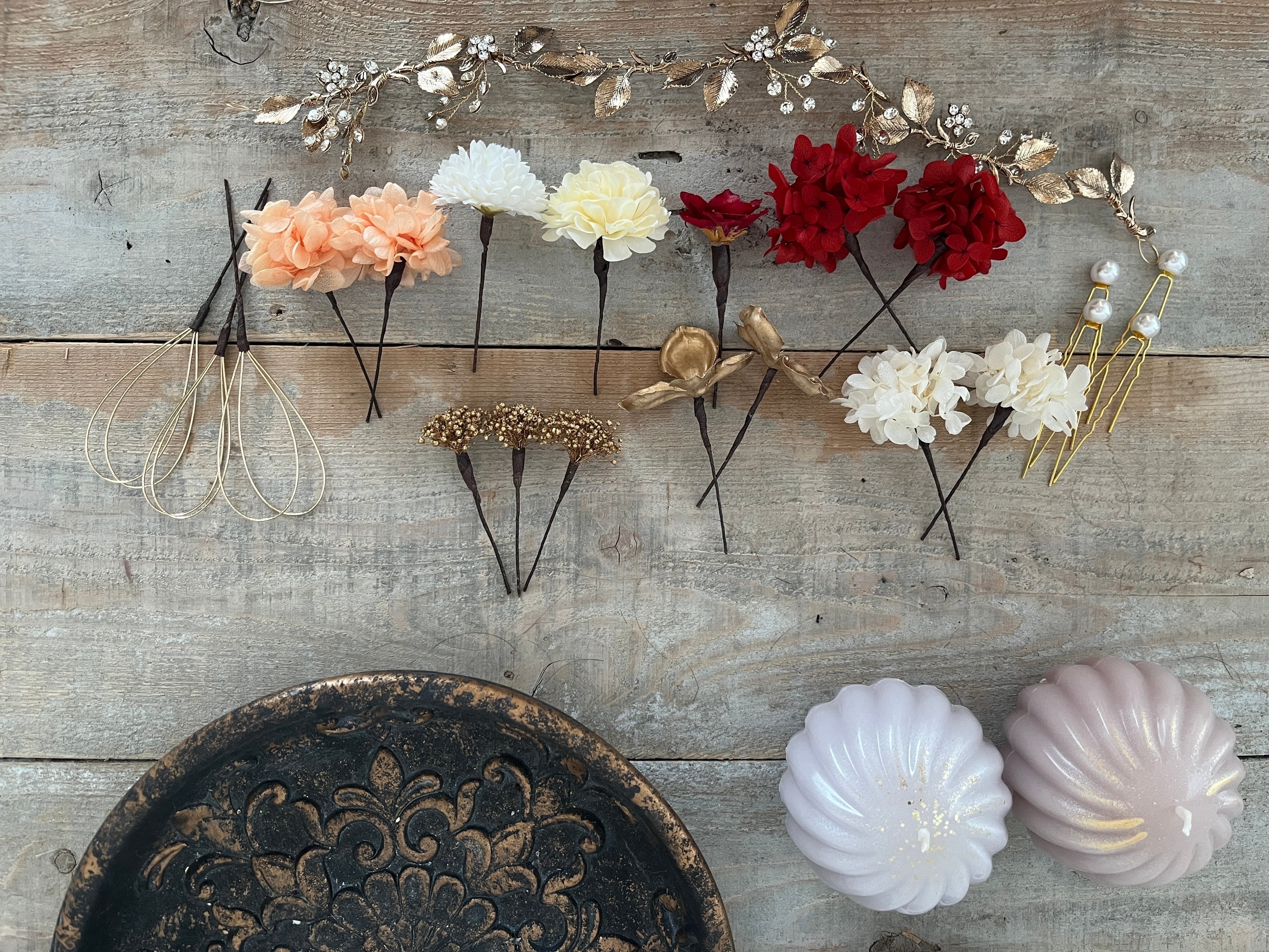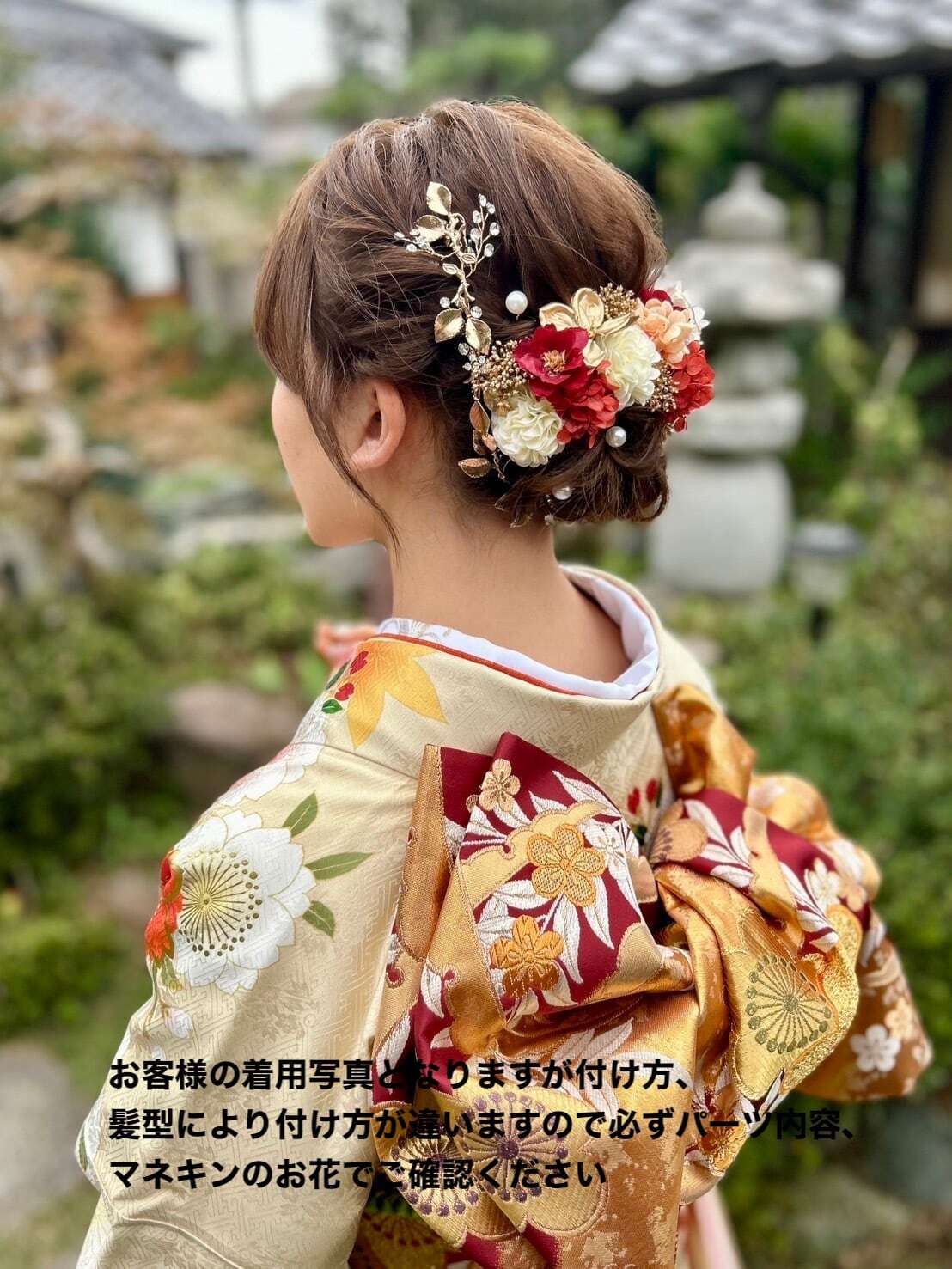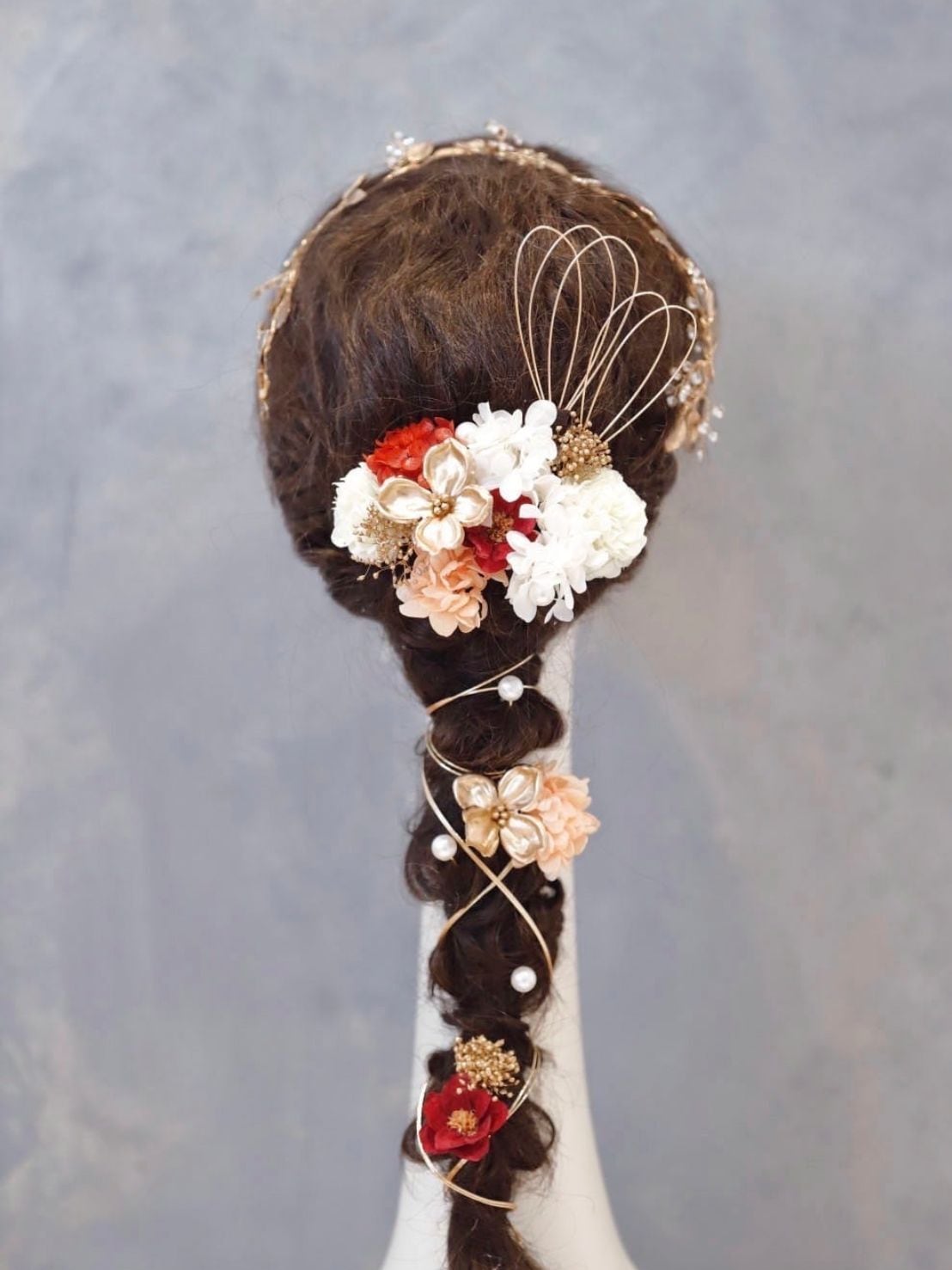 まとめ髪・編みおろし・シニヨンなど、髪型に合わせて自由に配置していただけます。