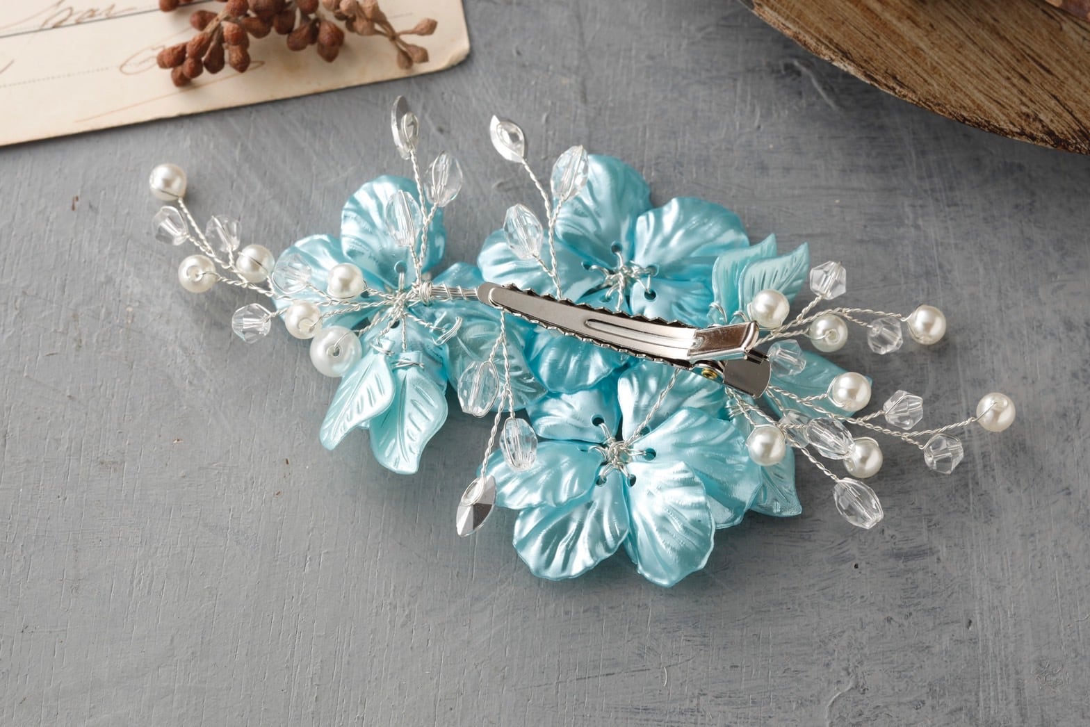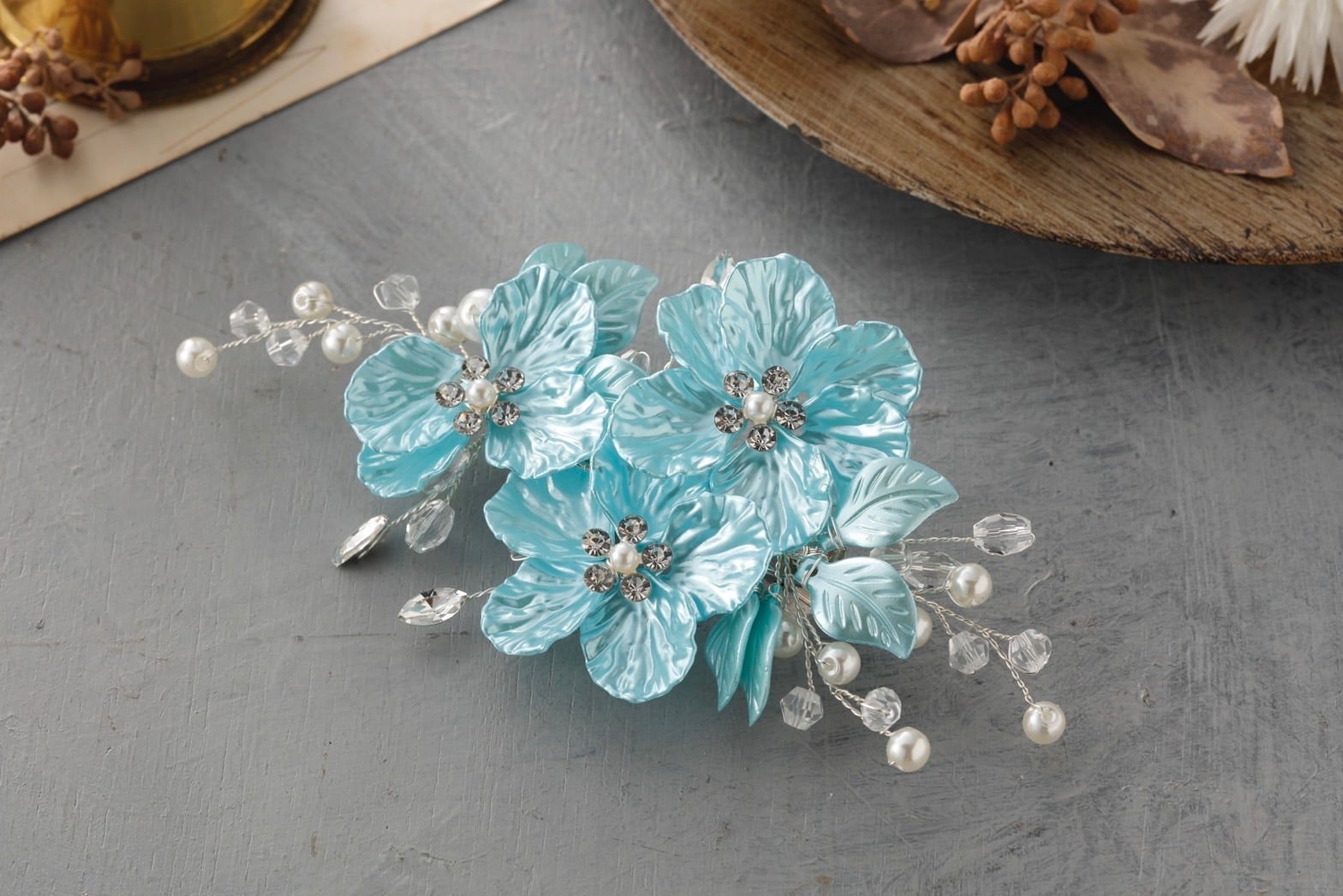 華やかなヘアスタイルを演出する、ブルーのフラワー小枝ビジュ。振袖や袴をはじめ、成人式の着物にぴったりのヘアドレスです。小さな花びらが可愛らしい、上品なデザインが特徴。
