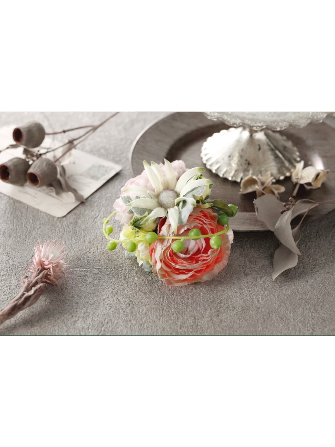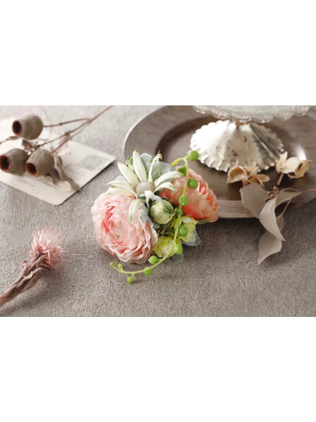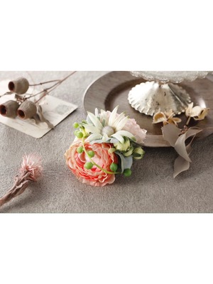 アーティシャルフラワー(造花)ラナンキュラス、フランネルフラワーなどでお作りしました大人可愛い色合いのコサージュです。