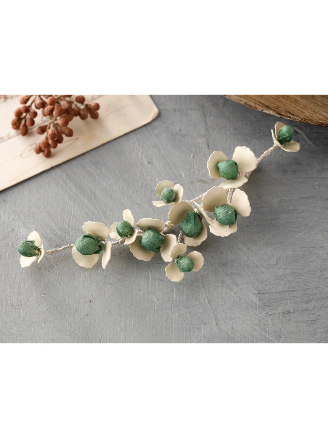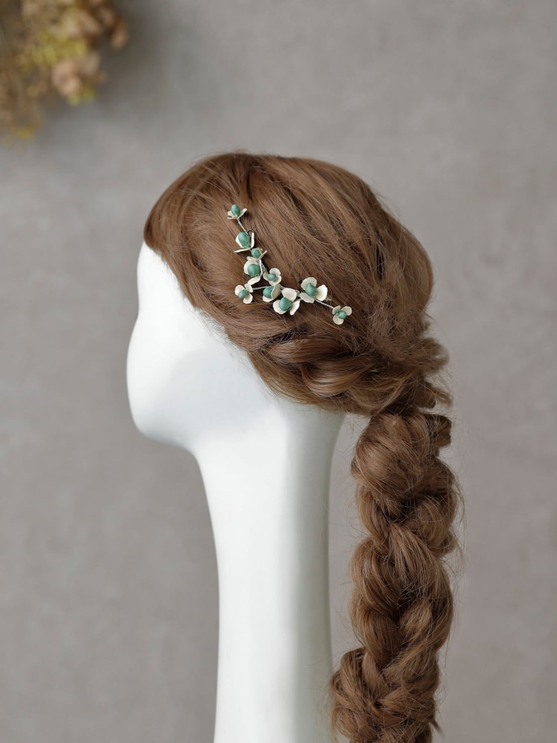 華やかなヘアスタイルを演出する、グリーンフラワー小枝ビジュ。振袖や袴をはじめ、成人式の着物にぴったりのヘアドレスです。小さな花びらが可愛らしい、上品なデザインが特徴。