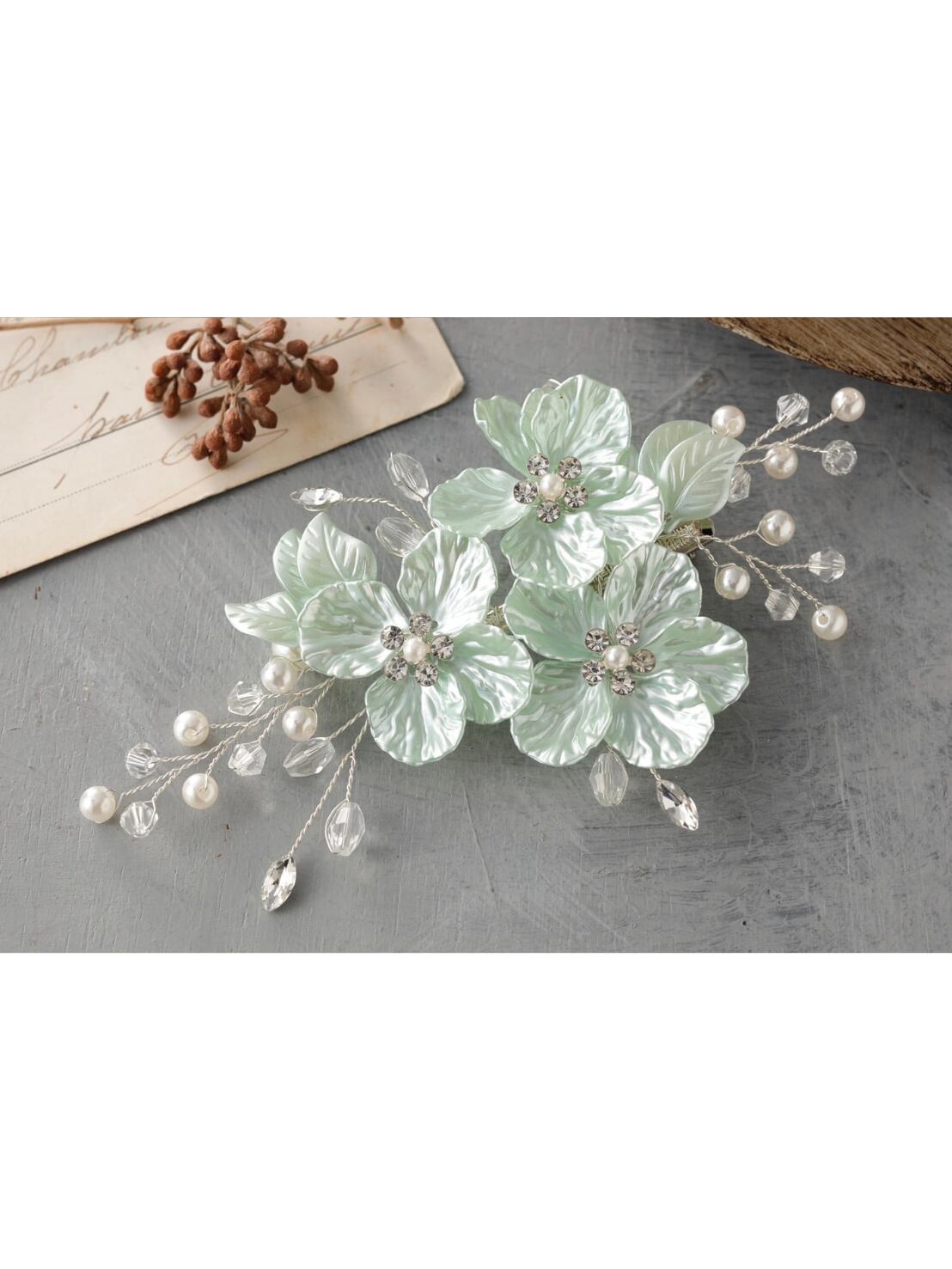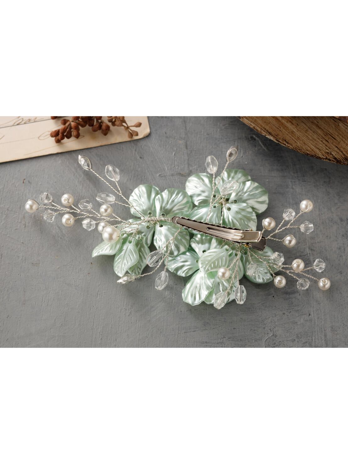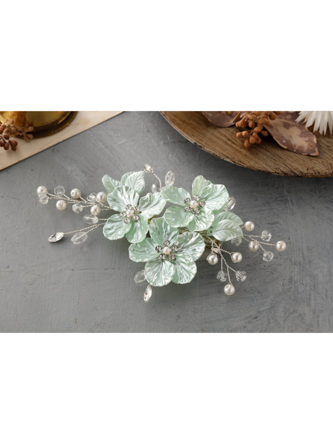 華やかなヘアスタイルを演出する、グリーンのフラワー小枝ビジュ。振袖や袴をはじめ、成人式の着物にぴったりのヘアドレスです。小さな花びらが可愛らしい、上品なデザインが特徴。