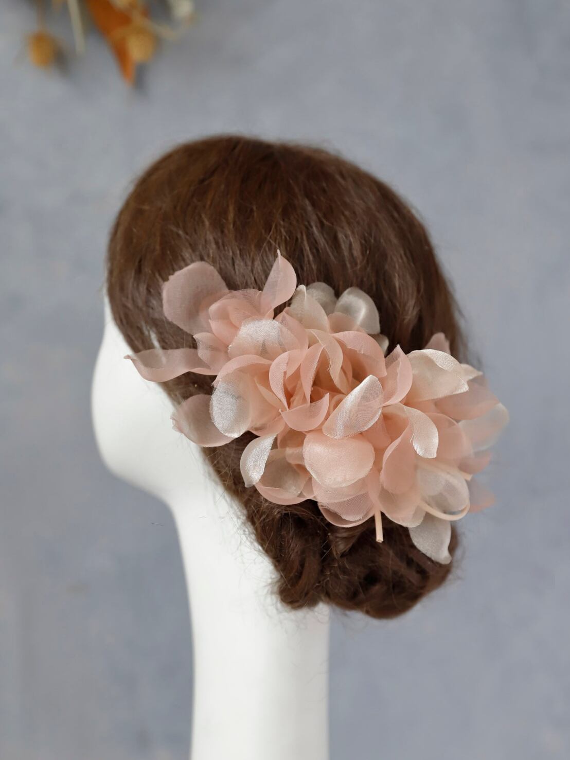 サテンシルク風フラワーヘッドクリップは、くすみピンクの色合いが特徴のエレガントなヘアアクセサリーです。シルク素材で作られた美しい花々が、女性らしい上品な印象を与えます。特に卒業式や成人式、ウェディングなど特別な日には、袴、振袖、白無垢、色打掛、浴衣、ウェディングドレスの相性も抜群です。