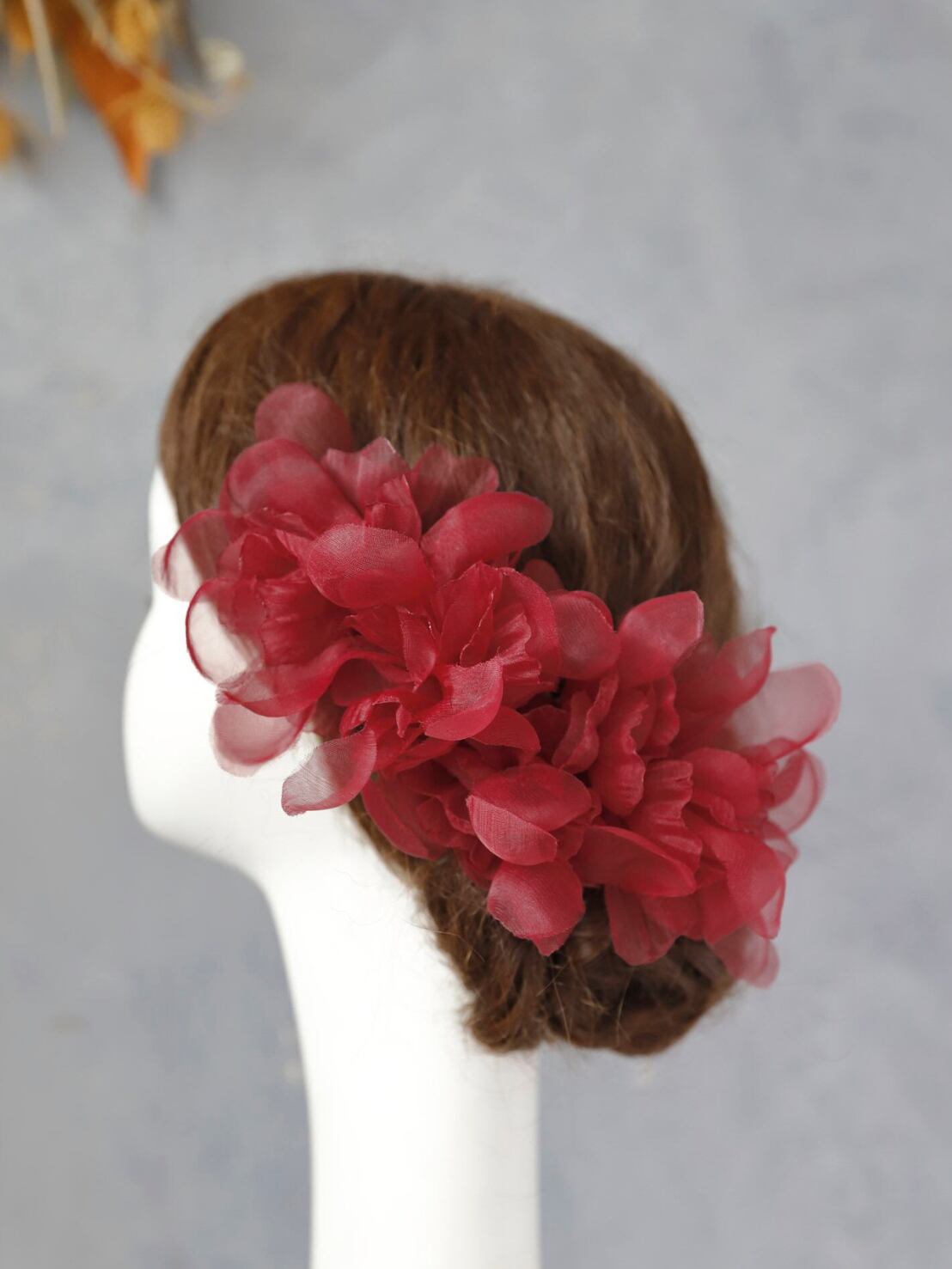 サテンシルク風フラワーヘッドクリップは、ワインレッドの色合いが特徴のエレガントなヘアアクセサリーです。シルク素材で作られた美しい花々が、女性らしい上品な印象を与えます。特に卒業式や成人式、ウェディングなど特別な日には、袴、振袖、白無垢、色打掛、浴衣、ウェディングドレスの相性も抜群です。