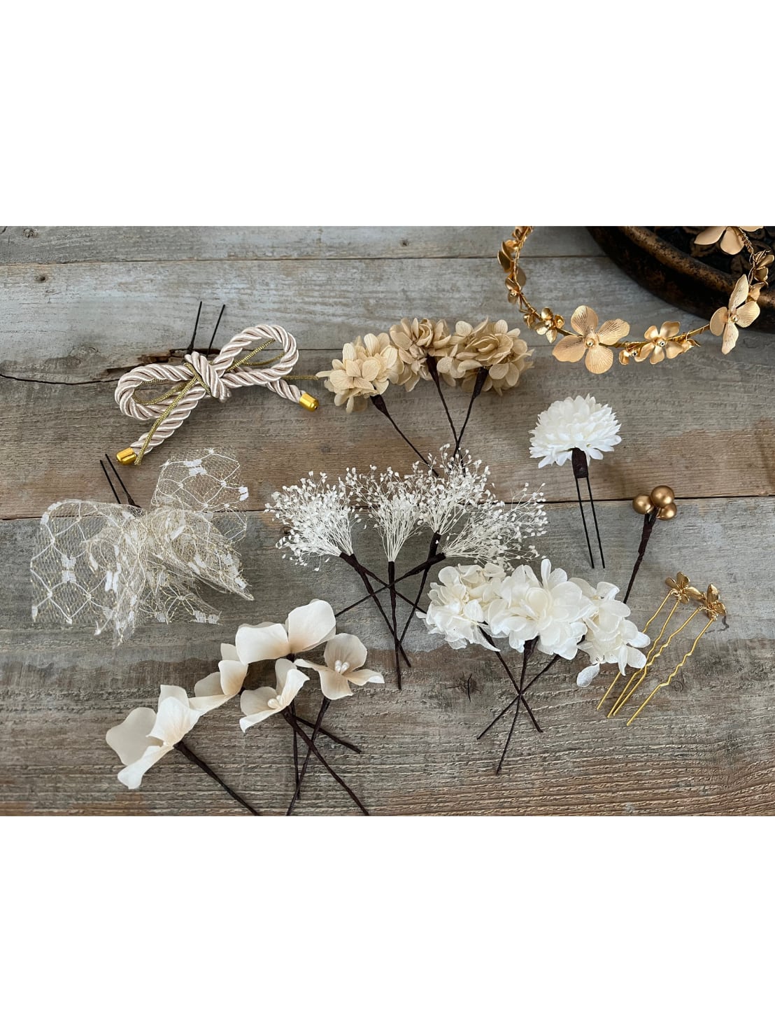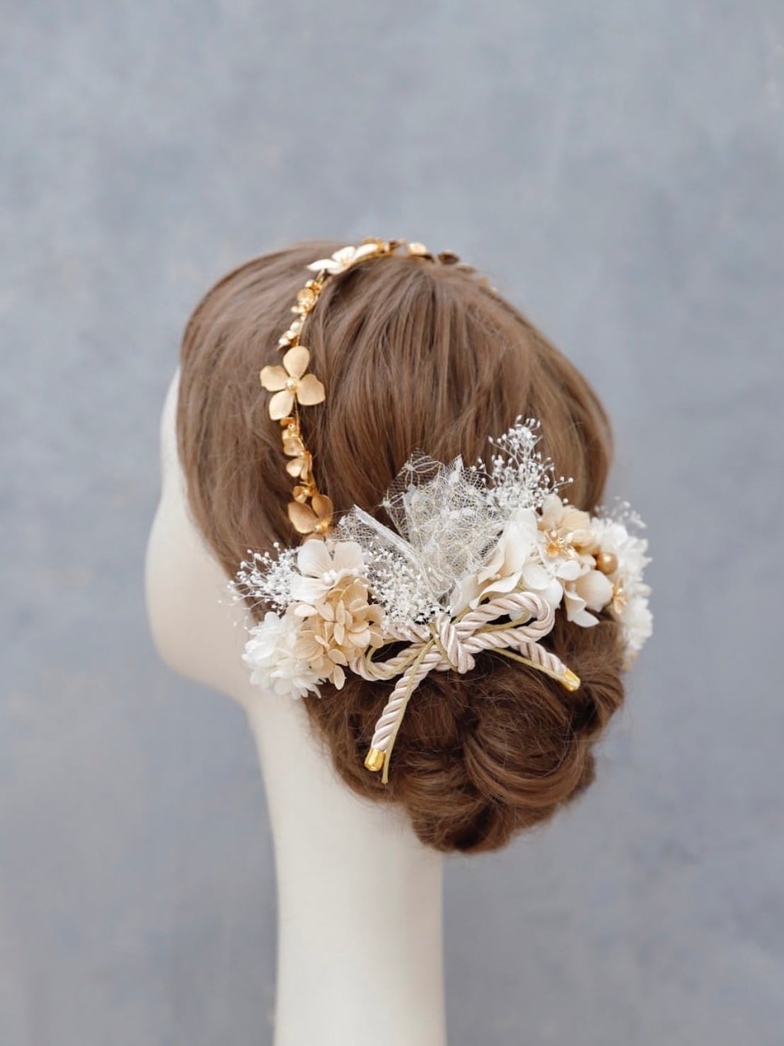 プリザーブドフラワー、真鍮フラワー、パールなどが入ったカチューシャ(ハンドメイド)